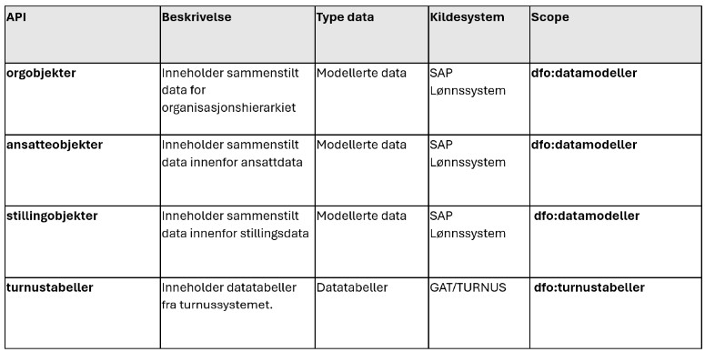 Rådatabtabeller er tilgjengelig på følgende APIer