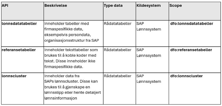 En oversikt over hvilke tabeller som er tilgjengelige i lønnsdatatabeller og referansetabeller finnes i dokumentasjonen under, men kan også finnes i vår midlertidige datakatalog. Vi gjør oppmerksom på at denne ikke oppdateres automatisk. Ta gjerne kontakt hvis dere ønsker denne skal oppdateres.